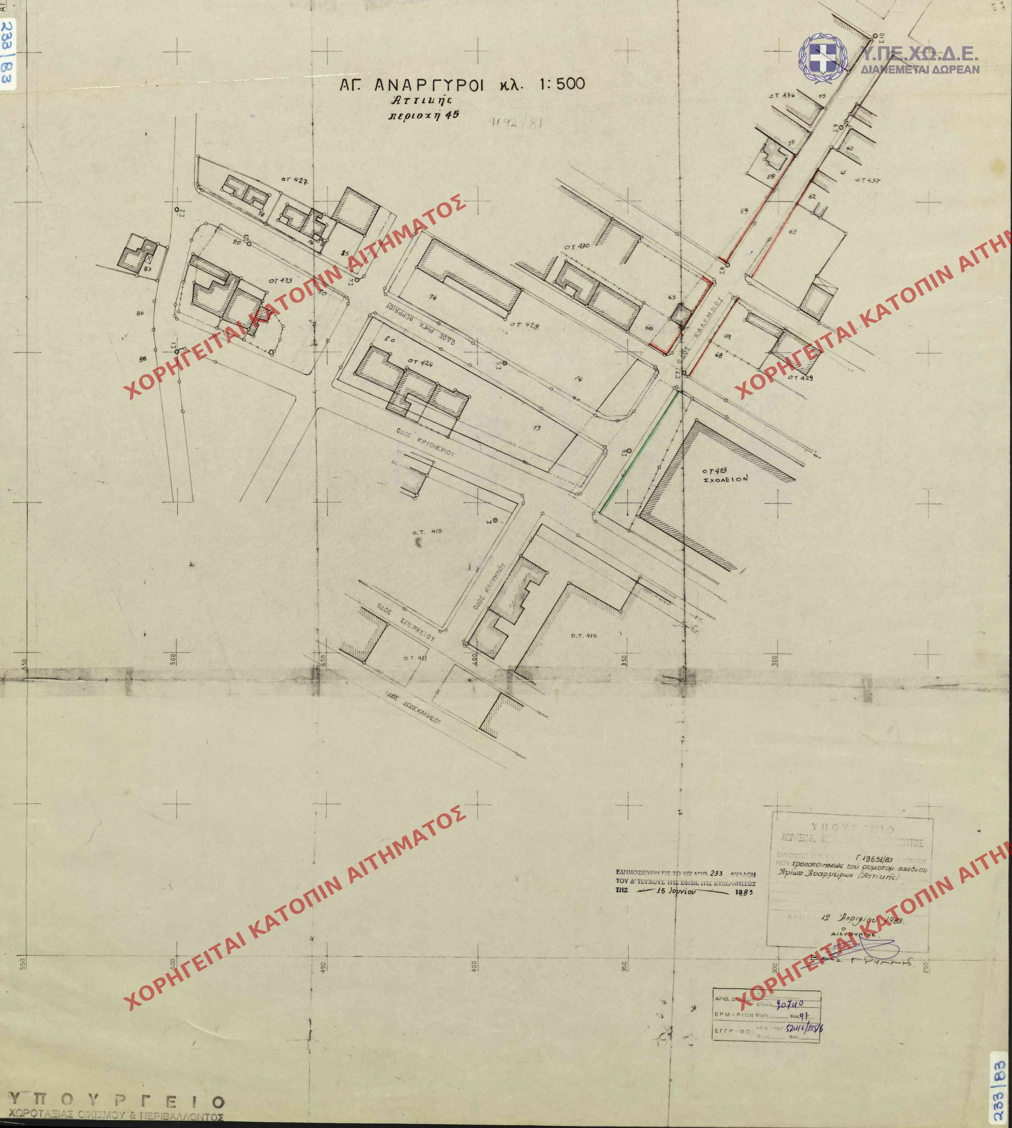 | 63269 | Π.Ε. ΑΤΤΙΚΗΣ | ΑΓΙΟΙ ΑΝΑΡΓΥΡΟΙ | - | 257 / 1956 | 14987 | ΠΡΩΤΟΤΥΠΟ | 1 | Προβολή | ||